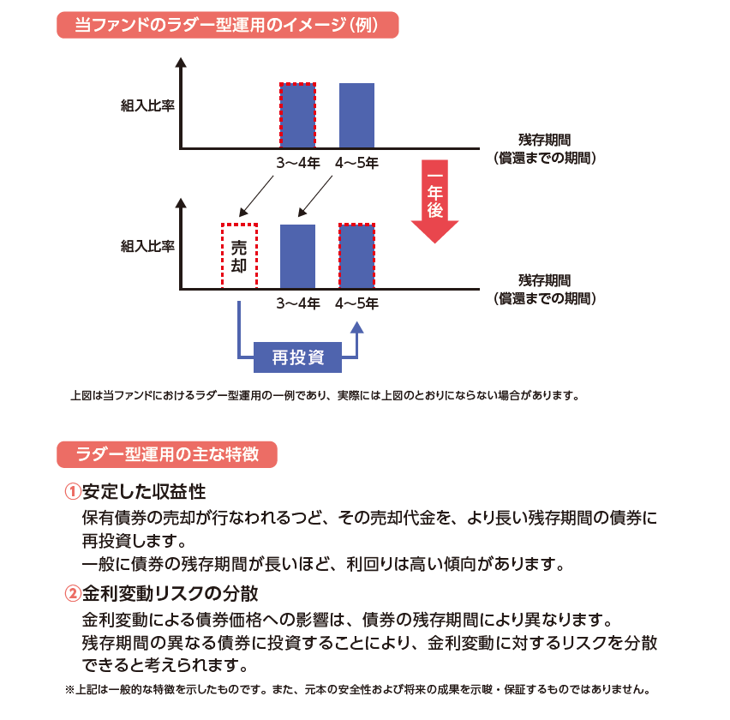 当ファンドは原則として、残存期間が3年から5年程度までの5年債として発行された米国国債に投資し、残存期間ごとの国債の投資金額がほぼ同程度となるように組入れるラダー(はしご)型運用を行います。