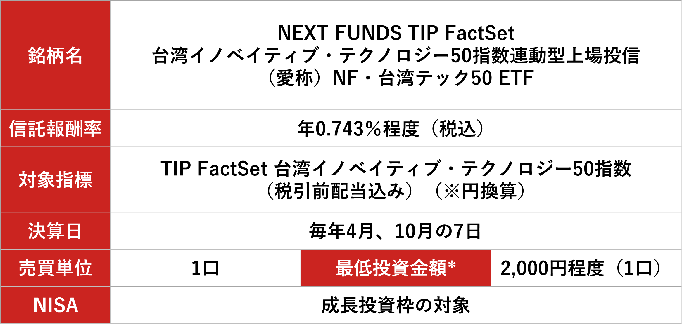| 対象指標 | TIP FactSet 台湾イノベイティブ・テクノロジー50指数(税引前配当込み) | ||