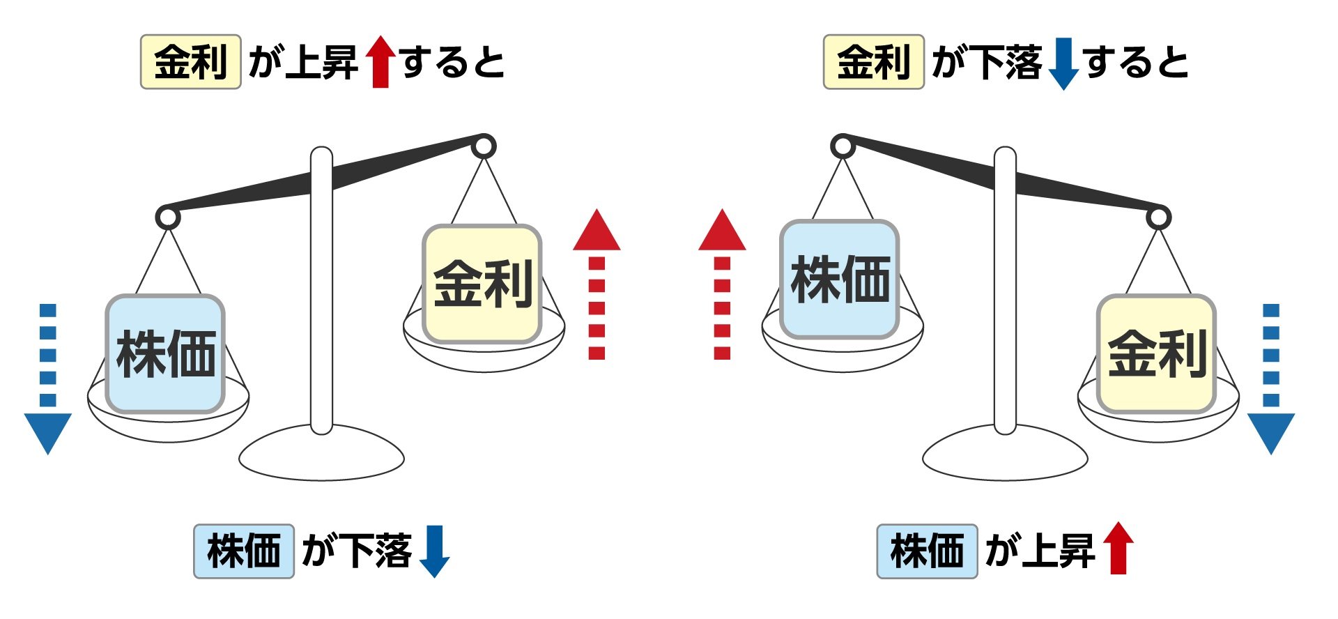 上のイラストのように、金利が上がると株価が下がり、金利が下がると株価が上がる傾向にあります。金利が上がると、お金を借りてビジネスに関係するものを買おうとする会社の負担が増して業績悪化につながるのに対し、金利が下がるとお金を借りる際の負担が減り業績アップにつながる可能性があるためです。