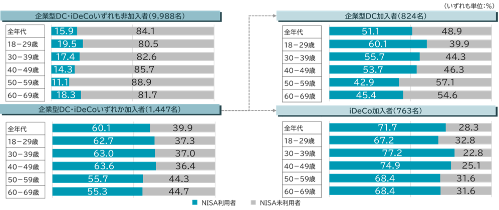 また、会社の制度である「企業型DC」の利用者では、約5割がNISAを利用、自ら能動的に申し込む「iDeCo」利用者では約7割と更に高いことが分かりました。