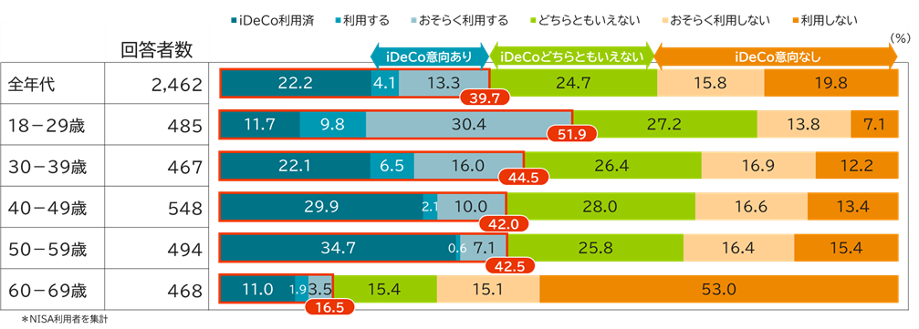 一方で、「(現在利用していないが、)利用意向がある層」も含めると、一転して若年層の方が高い傾向になっていました。18~29歳でNISAを利用している若年層において、「iDeCoを利用している/利用意向がある」人の割合は51.9%に上ります。