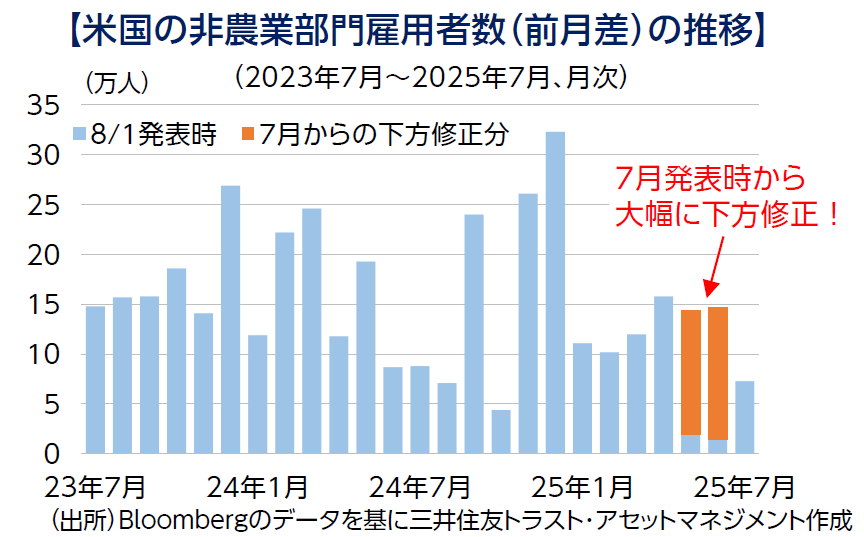 米国の経済指標の中で特に注目度が高いのが、毎月第1金曜日に公表される雇用統計です。先般8月1日公表の最新分は、波乱含みの結果になりました。5月分と6月分が合わせて▲25万人超も下方修正されたのです。これまで堅調とみていた米雇用が、実は減速していたことが示されたわけです。気分を害したトランプ大統領が労働統計局のトップを解任するという異例の展開まで起きました。市場関係者の間でも、「今後も雇用統計に注目し続けて良いのだろうか?」という不信感が浮かび上がりました。