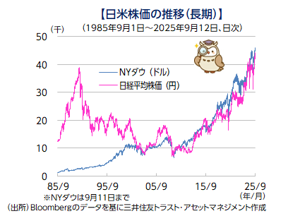 9月12日、日経平均株価は前日比+395円の44,768円となり、過去最高値を連日で更新しました。米国株式市場でも11日に、主要3指数がそろって最高値を更新しています。日米ともに株価が上昇する中、一部では警戒の声も聞かれています。確かに過去を振り返ると、2008年のリーマンショックなども含め、株価の大幅な上昇とバブル経済、そして崩壊という過程を繰り返してきました。日本では特に、1980年代後半のバブル経済が崩壊した後、長期の景気低迷に陥りました。この教訓は世界的にも共有されており、好調な株価が続く場合は、都度点検してみることが必要かもしれません。