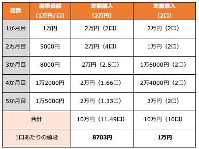 例として、投資信託を2万円ずつ定額購入した場合と2口ずつ定量購入した場合をガソリン同様に比較してみましょう。投資信託の値段(基準価額)が次のように変動したとすると、1口あたりの値段が変わります。