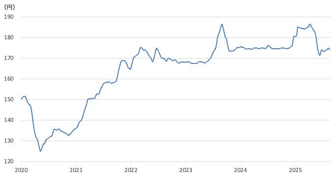 2020年にはリッター130円を切っていた時期もありましたが、2021年以降は右肩上がりに。2024年・2025年は170円〜180円台となっており、高止まり傾向が続いています。