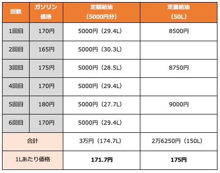 ガソリン価格が給油のたびに変動するとして、毎週5000円ずつ(定額)で6回給油する場合と、隔週50リッターずつ満タン(定量)で3回給油した場合の金額は、次のように変わります。