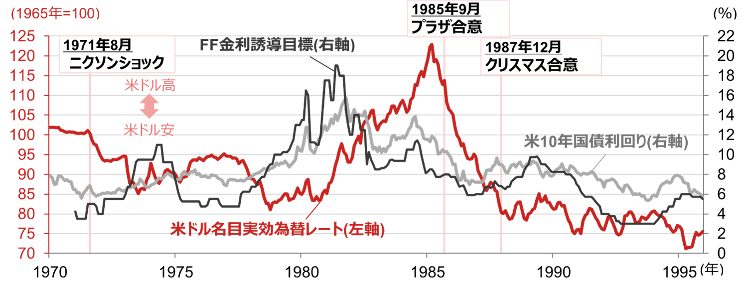 米国の貿易赤字の増大は本来、円高・米ドル安を喚起し、貿易赤字の削減につながるという、為替の調整メカニズムが働きます。しかし、当時の市場ではこの調整メカニズムが機能せず、主要通貨に対する米ドル名目実効為替レートは上昇傾向にありました(図表1)。