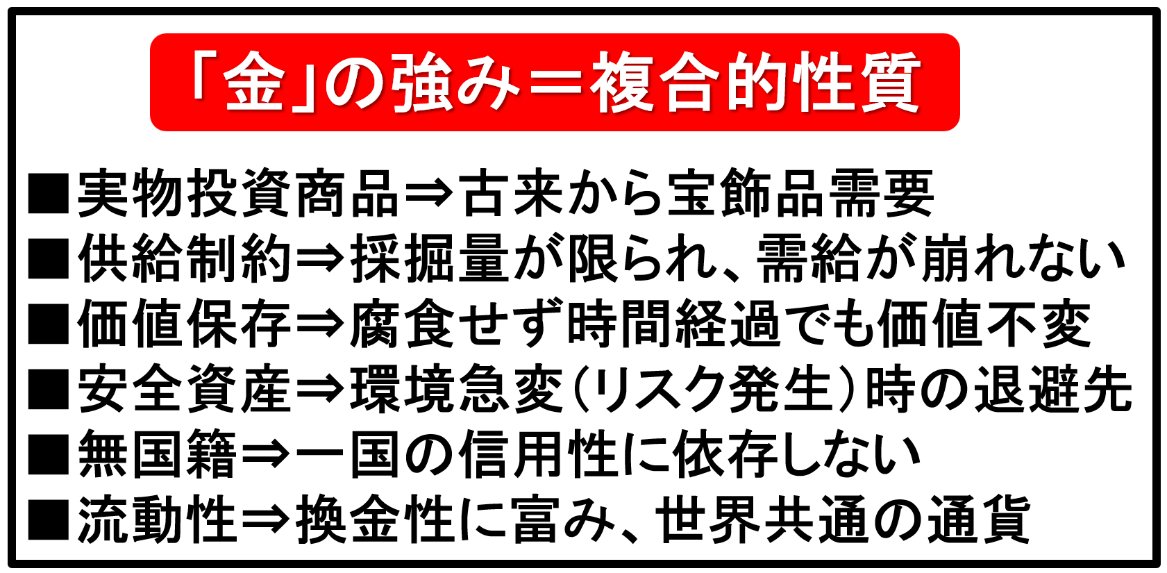 金の属性、性質をマーケットの視点でいうとどうでしょうか?