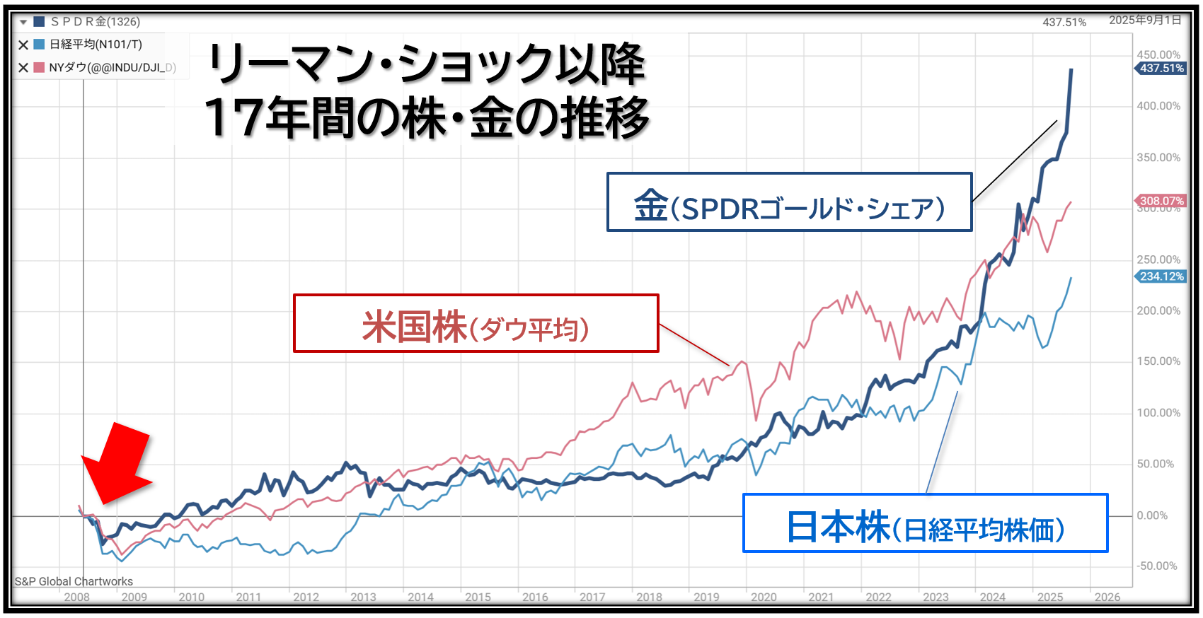 グラフはリーマン・ショックが起こった2008年半ばからおよそ17年間の株と金の推移です。株式は日経平均株価とダウ工業株30種平均を、金は代表的な金ETF(上場投資信託)である「SPDRゴールド・シェア」(国際金価格に連動)を選び、値動きを比べてみました。