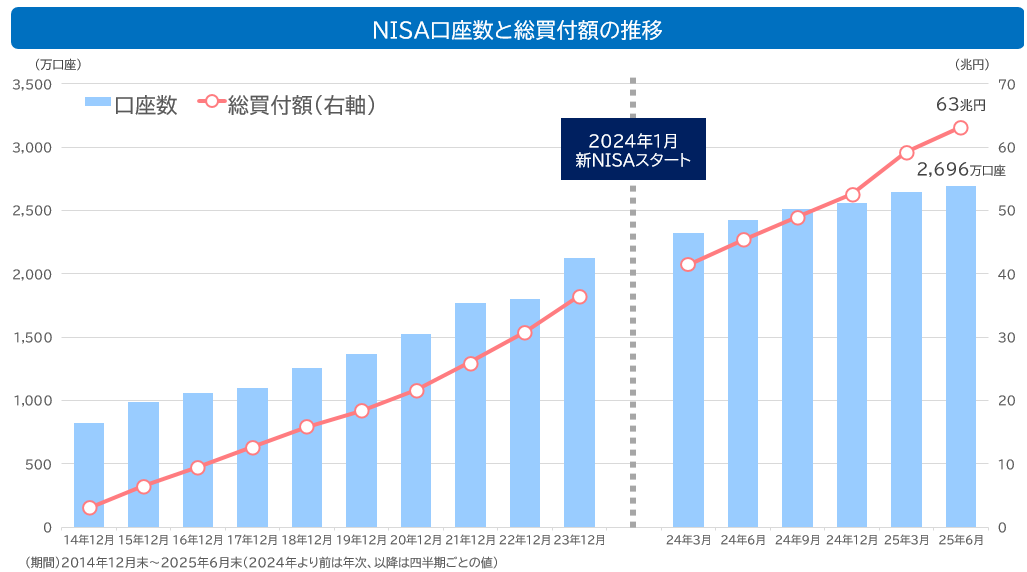 金融庁が2025年9月24日に公表したデータによると、2025年6月末時点で口座数は2,696万口座、旧制度も含めた総買付額は63兆円に達しました。