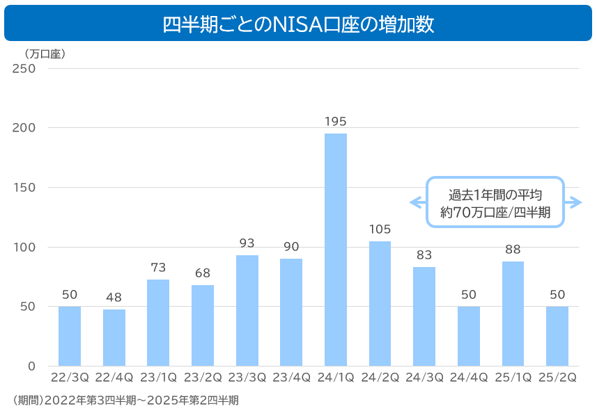 新NISAがスタートした2024年第1四半期には約195万口座も増加しました。しかし、その後の口座数の伸びは鈍化し、2024年第4四半期や2025年第2四半期の増加ペースは、「資産所得倍増プラン」公表前の水準(例:2022年第3四半期)と同程度に戻っています。