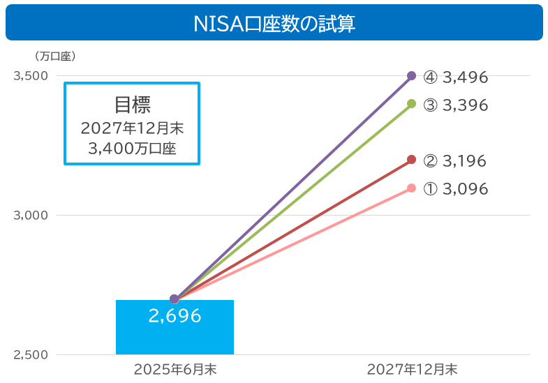 過去1年間(2024年第3四半期~2025年第2四半期)の平均並みである、四半期で70万口座ずつ増加したとしてようやく目標達成が見えてくるという水準です。目標達成には何かしら新たな取り組みが求められます。