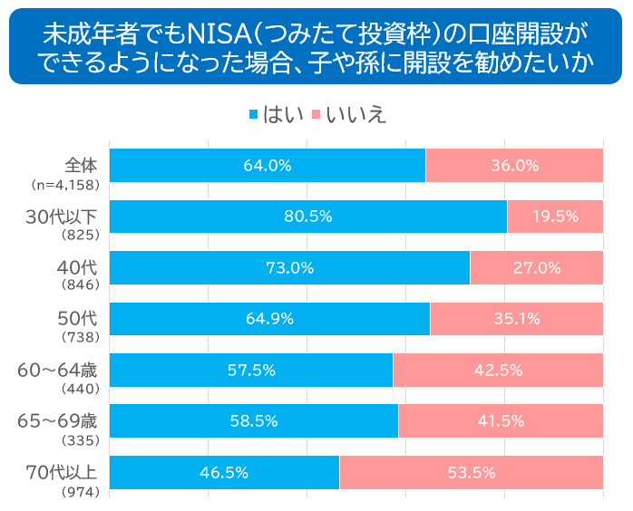 【図表4】は、NISA口座保有者に対して、「NISA は18歳以上でないと口座開設できませんが、未成年者でもNISA(つみたて投資枠)の口座開設ができるようになった場合、子や孫に開設を勧めたいですか。」と聞いたアンケート結果で、大半が「はい」(64.0%)と答えており、また、30代以下や40代など年代が若い回答者ほど「はい」の割合が高い結果となり、こども支援NISAに対する期待は高いと言えそうです。
