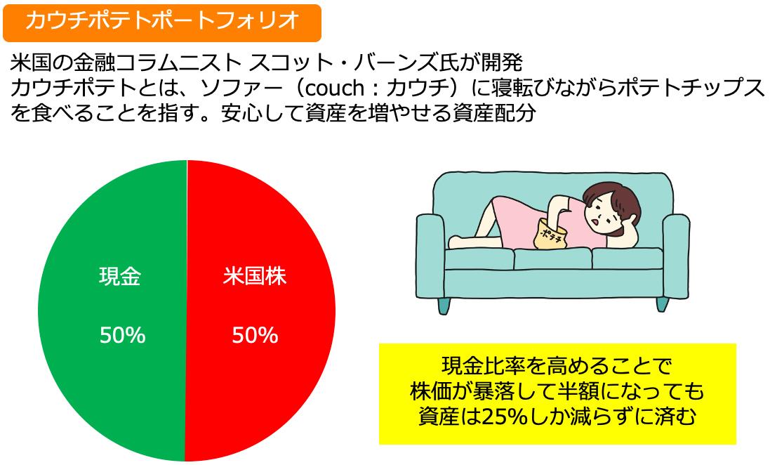 カウチポテトとは、ソファー(couch:カウチ)に寝転びながらポテトチップスを食べることを指す言葉。安心して資産を増やせる資産配分ということで、現金半分、米国株半分というシンプルな資産配分になっています。