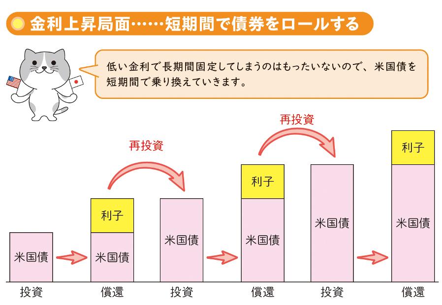 金利上昇局面は償還日までの残存期間の短い米国債を購入して償還まで保有していきます。償還日を迎えたら、元本+金利分を次の残存期間の短い米国債に再投資していきます。金利上昇局面が続いていれば、再投資の際によりたくさん金利がもらえる利付債を購入できるようになります。