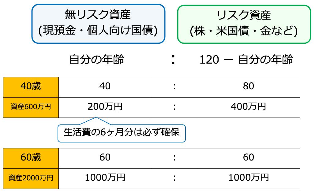 120の法則は、無リスク資産とリスク資産の割合を「自分の年齢:(120−自分の年齢)」に置き換えるというものです。