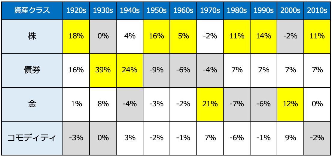 次の表は、1920年代から2010年代までの100年間を10年ごとに区分して、株・債券・金・コモディティの4つの資産クラスの実質リターン(インフレを考慮したリターン)がどうだったかを示したものです。もっともパフォーマンスがよかった資産を黄色、もっともパフォーマンスが悪かった資産をグレーにしています。