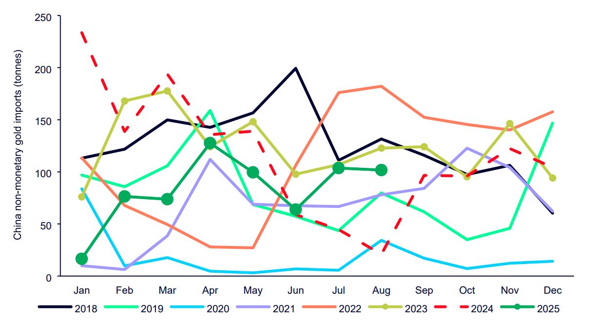 • 2025年の金ETFへの資金流入は2000年以来の高水準となっており、2025年9月の月間流入額は米ドル建て名目額ベースで過去最高を記録しました 10。しかし、トン数ベースの総保有量は依然としてパンデミック時のピークを下回っています。これにより、たとえ金ETFの買いがコンセンサストレードだとしても、金の保有が過剰ではないことが示唆されます。