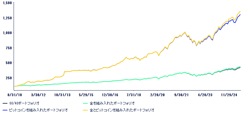 図表4:60/40ポートフォリオにビットコインと金を追加した場合の影響