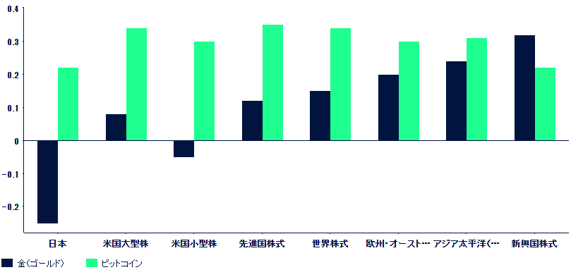 金の相関係数は、対MSCIジャパン指数の-0.25から対新興国市場の0.32までで、他のさまざまな株式指数との相関性も総じて低水準となっています 3。これに対して、ビットコインの相関性は全体的に高く、相関係数のレンジは対MSCIジャパン指数の0.22から対先進国株式の0.35までで、米国大型株とグローバル株式の相関係数も同様に高水準となっています 4。