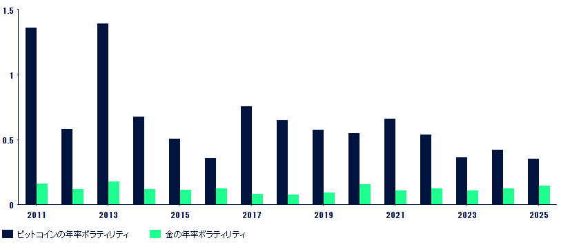 金は歴史的に見て特定のディフェンシブ特性を示しており、市場環境の悪化に対するヘッジを提供し、価値貯蔵手段の役目を果たしてきました。一方、ビットコインは、新たなリターンの源泉となる可能性はありますが、ポートフォリオ全体のリスク上昇につながるという代償を伴います。