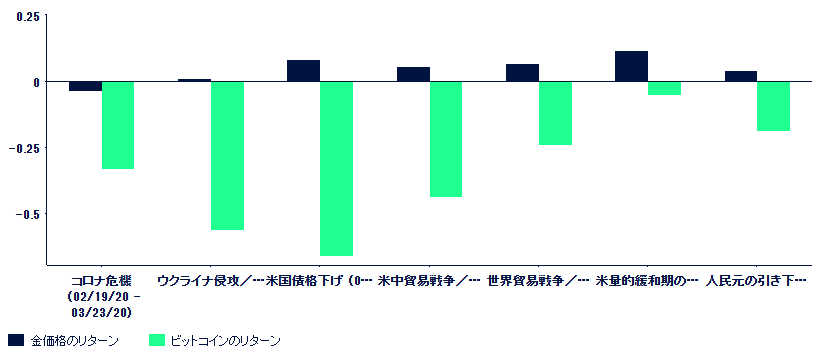 図表2:主な相場下落局面におけるビットコインと金のリターン