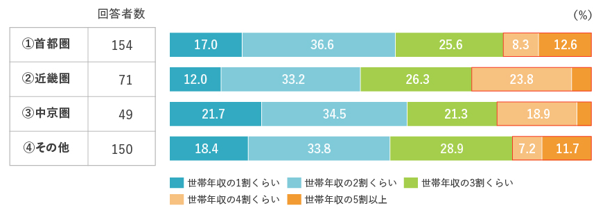 特に近畿圏では、他のエリアと比べて返済比率が高い傾向が見られました。これは、前回のコラムでも解説した通り、近畿圏では他エリアと比較して若いうちに住宅を購入する傾向が強いことから、結果的に返済比率が高くなっていることが考えられます。