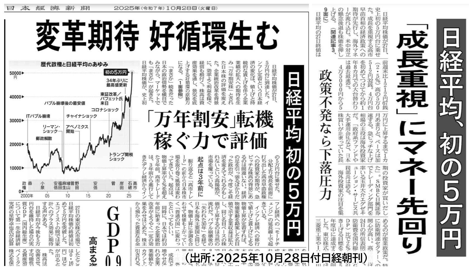 日経平均、「高市相場」で10月上げ幅最大 初の5万2000円台乗せ(日経電子版 2025年10月31日)