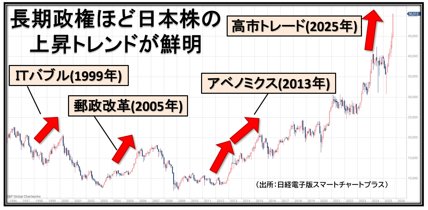 この爆発的な上昇を演出したのは「高市トレード」です。10月以降は連日、「高市トレード」「高市ラリー」が報じられ、10月下旬には日経平均株価が未踏の5万円台に乗せました。