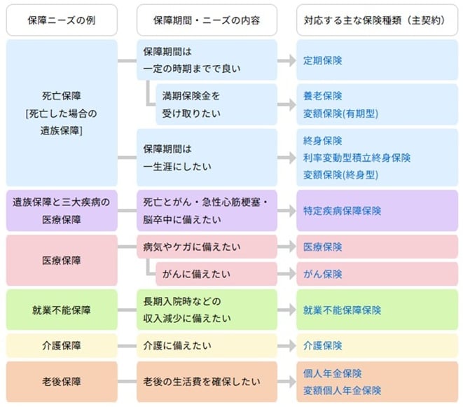 下の図1は保障のニーズ例と保障期間・ニーズ内容、そしてそれぞれに対応する主な保険の種類(主契約)を整理したものです。