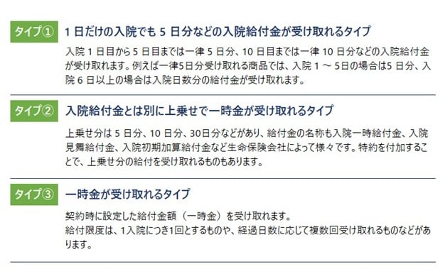 • 「1泊2日型」:継続して2日以上入院したとき、1日目から入院給付金が受け取れる。