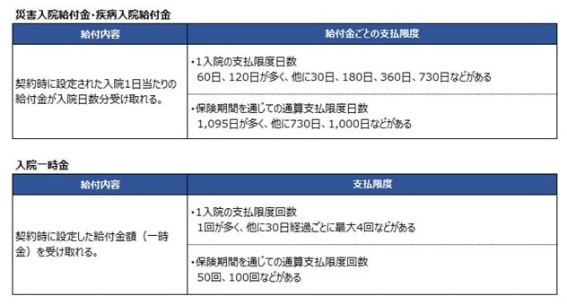 一般的に、「災害入院給付金」「疾病入院給付金」「入院一時金」などは、給付金ごとに1回の入院での支払限度日数(回数)や、保険期間中の通算支払限度日数(回数)が設けられています。