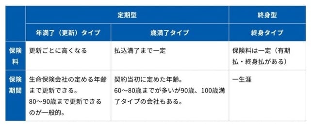 年数で決まる「年満了(更新)タイプ」の保険料は契約当初の保険料負担は抑えられますが、更新時に再計算され、齢が上がることなどによって、通常、更新ごとに保険料が高くなります。一方、70歳、80歳までなど年齢で決める「歳満了タイプ」や、一生涯保障が続く「終身タイプ」の保険料は一定です。