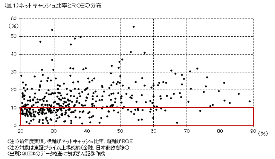 ただ、日本経済が長期にわたるデフレ状態から脱却し、インフレが意識される局面へと変化するなか、保有する現預金の水準が適正なのか、再考する必要はあると思います。(図1)は、QUICKのデータに基づき、東証プライム上場銘柄(金融、日本郵政を除く)を対象に、総資産に占めるネットキャッシュ(現預金+有価証券-有利子負債)の比率が20%以上の「お金持ち銘柄」について、ROEの分布状況を見たものです。ROEが10%未満にとどまっている銘柄の割合は約4割。決して少なくないというのが現状です。