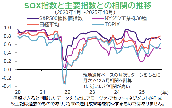 このような背景から、日経平均とSOX指数(フィラデルフィア半導体株指数、半導体関連30社で構成)との相関は高い。10月末時点の12ヵ月相関(月次、ローカル・リターン)は日経平均が0.80と、S&P500種株価指数(0.72)やNYダウ工業株30種(0.50)よりも高くなっている。ただし、2020年のコロナ禍時のテック株志向(ITプラットフォーマーや巣ごもり需要)が強かった時期と比べると、現在は低下している。2022年ごろの相関の低下度合いの違いは、日米の経済回復タイミングなどが要因と考えられる。
