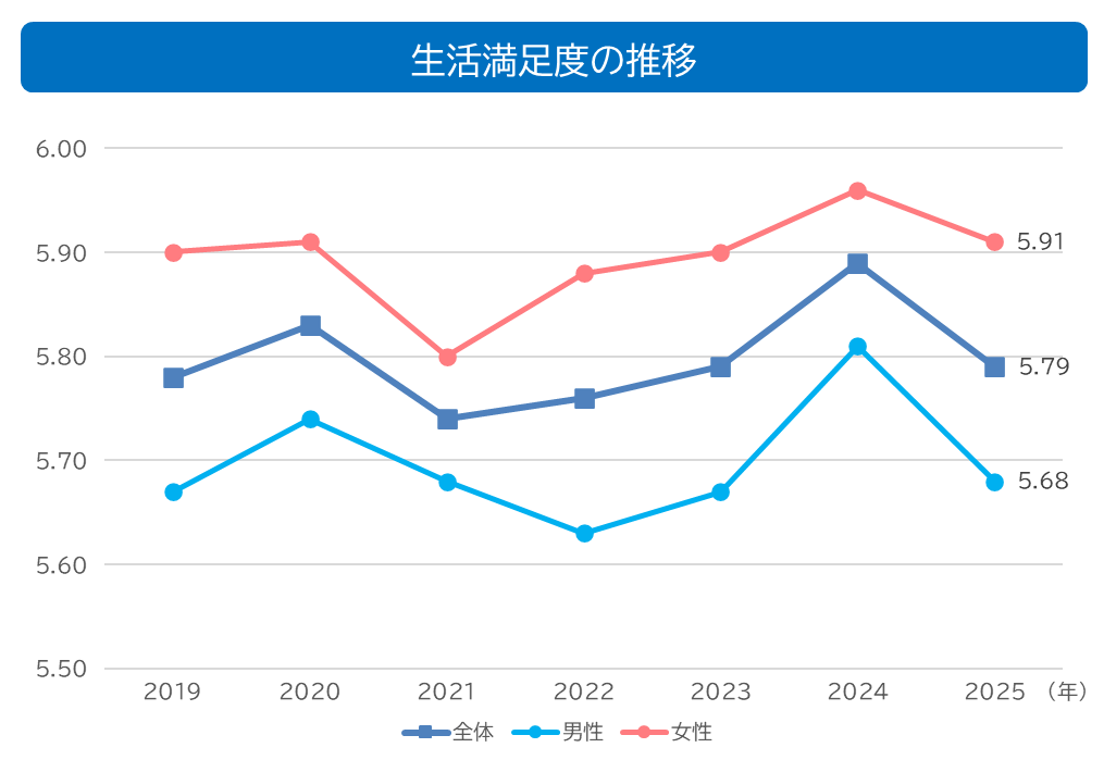 なお、男女別に見ると、生活満足度は女性の方が男性より高い傾向にあることが分かります。