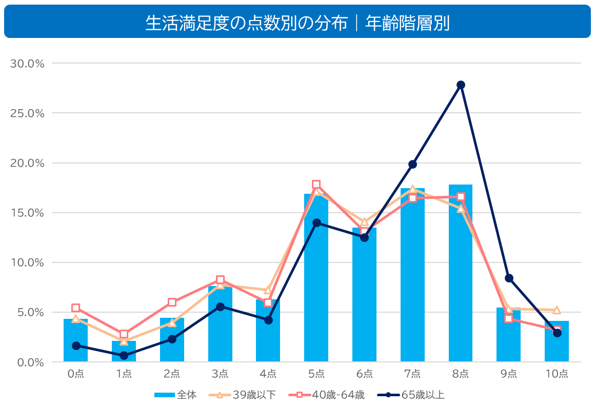 全体の生活満足度は5.79でしたが、その点数の分布を示したものが【図表3】です。棒グラフが全体の分布、折れ線グラフが年齢階層別の分布を表しています。全体では5点~8点に点数が集中しています。中間が5点なので、イメージとしては生活に対して「普通」~「かなり満足」と感じている人が約3分の2を占めています。