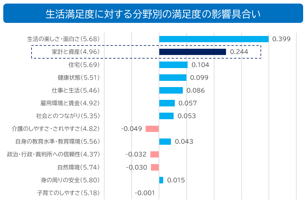 ここで注目したいのは、「家計と資産」の満足度が5点未満と不満寄りである一方で、生活満足度に対する影響が大きい点です。「家計と資産」に対する不満を解消し、この分野の点数を引き上げることが、生活満足度全体の改善につながると考えられます。