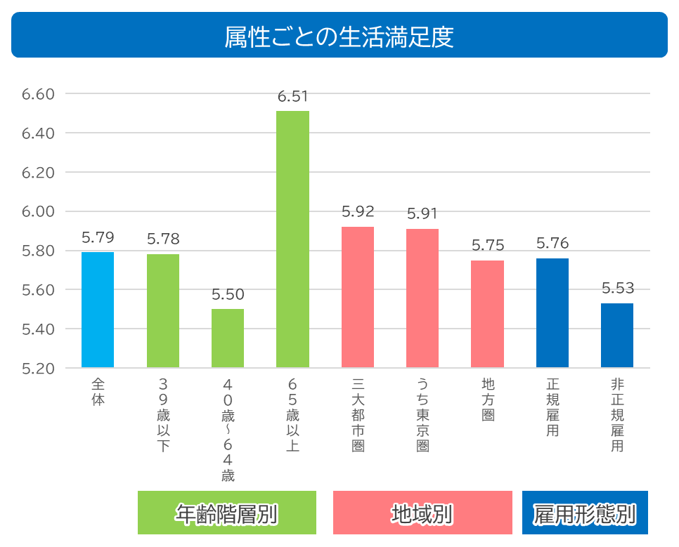 【図表2】では、年齢階層別や地域別、雇用形態別といった属性別の生活満足度を示しています。年齢階層別では65歳以上が6.51と突出しており、40歳~64歳の層と約1ポイントもの差があります。地域別では地方圏に対して都市圏の方がやや高く、雇用形態別では正規雇用の方が高い結果となっています。過去の調査においても同じ傾向が見られます。