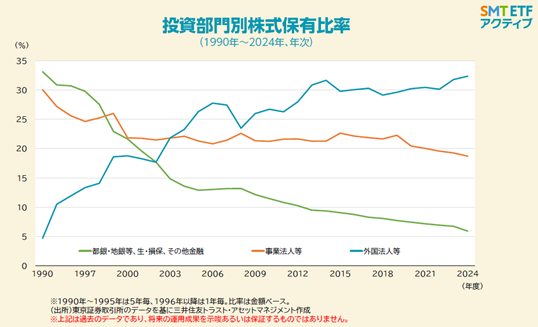 2024年度調査結果によると、外国法人等の株式保有比率が過去最高を更新する一方で、金融機関(都銀・地銀、生損保等)の株式保有比率は過去最低を更新しました。また、事業法人等の株式保有比率が大幅に低下している点も注目です。
