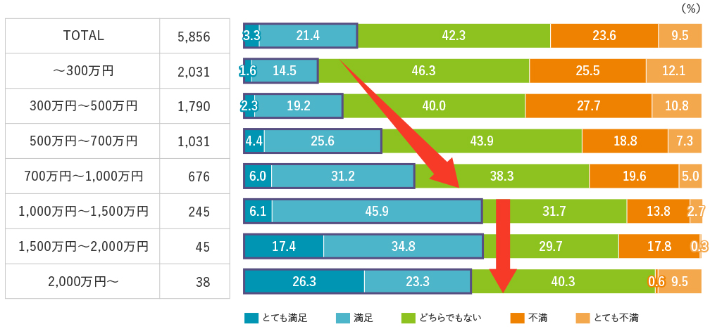 勤労者の報酬満足度は、年収1,000万円超から頭打ちに