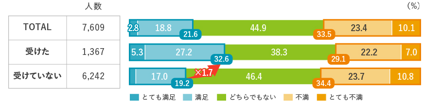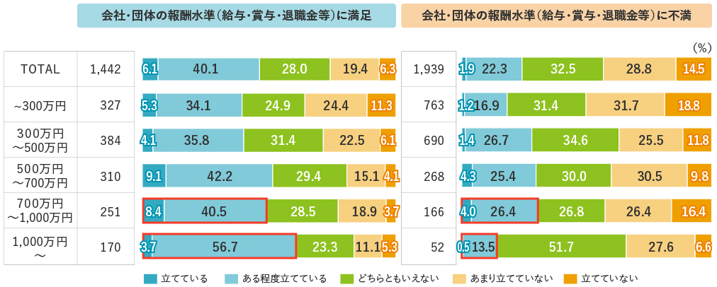 今回の分析では、報酬に対して「とても満足」「満足」との回答者を「満足している群」、「不満」「とても不満」との回答者を「不満がある群」と称し、この両者の「家計行動」の違いを考察していきます。