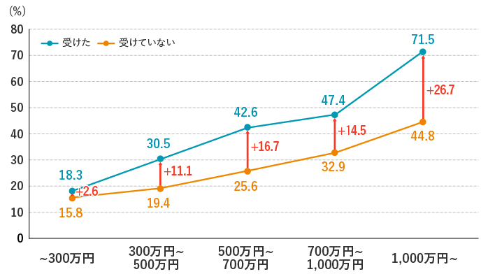 【図表2-2】職場絵の金融教育経験と報酬満足度が高い人の割合(年収別)
