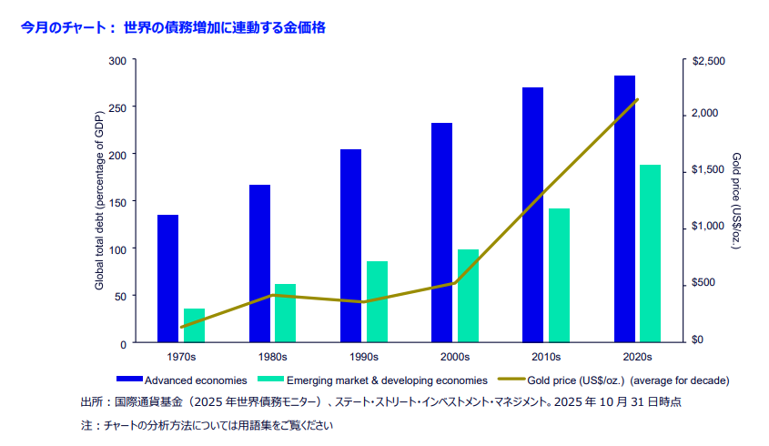 • 1970年代以降、法定通貨への移行、財政政策の積極化、金融のグローバル化により、先進国・新興国ともに 債務水準が急上昇してきました。このように信用創造が制約なく行われるシステムのもとでは、市場による抑制効果も限定的です。このマネーと債務が複合的に拡大する環境下で、金は価値を維持するための重要な基盤として役割を果たし続けています。