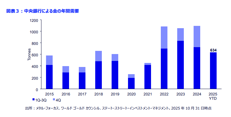 中央銀行は第3四半期も構造的な金需要の源泉となり、価格上昇にもかかわらず購入は堅調を維持しました。これは金価格の下限水準を押し上げ、価格の下方変動リスクの抑制に寄与しています。