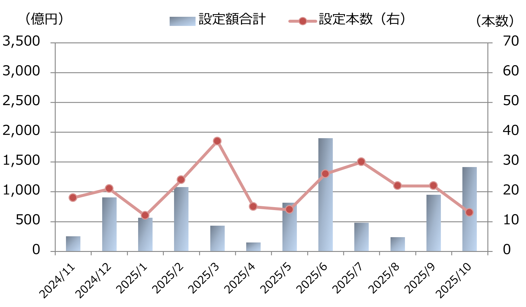 10月の新規設定額は約1,410億円となり、前月(約950億円)から大きく増加した。一方で、新規設定本数は13本と前月(22本)から減少した。