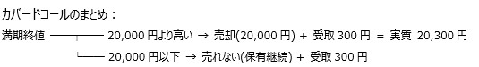 約束のとおり、20,000円で株を売却することになります。しかし、この売却代金に加えて、前述のオプション料300円も加えた金額である20,300円が収入総額となり、元々考えていた指値売りより300円得しました。