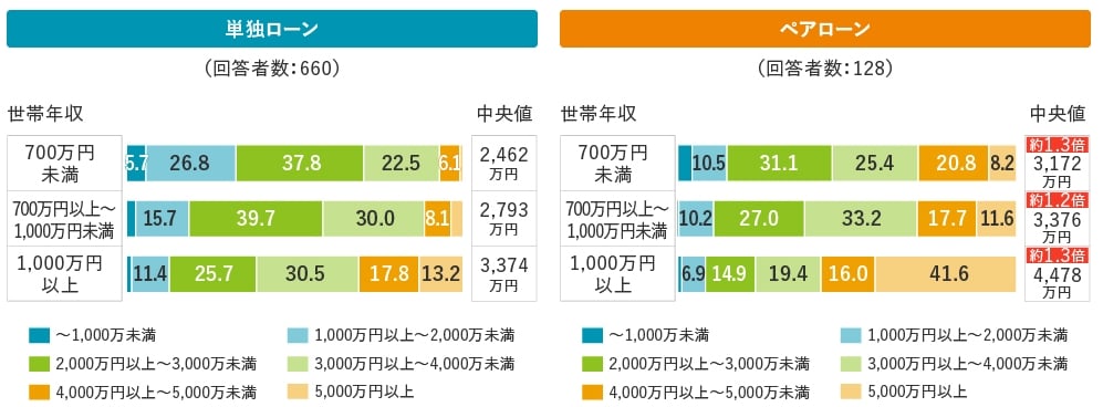 一方で、ペアローンを利用した方では、「ペアローンではなく単独ローンにすればよかった(22.4%)」が最も多く、5人に1人はペアローンで借り入れたこと自体に後悔していることが分かりました。ミライ研のアンケート調査によると、ペアローンの借入金額中央値は、単独ローンの約1.3倍に達しており、世帯年収区分に関わらず高額化の傾向がみられます(図表4)。また、借入金額は世帯年収が高いほど高額帯の比率が高くなっていることからも、ペアローンにより結果的に負担が大きくなったと感じる人が少なくないことがうかがえます。
