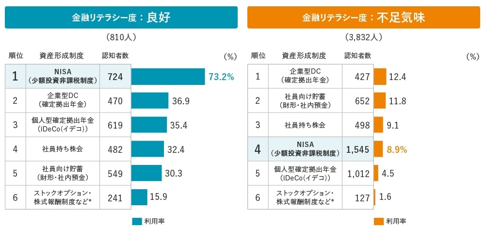 金融リテラシー度が「良好」な層では、社員向け貯蓄やiDeCo、企業型DCなどは認知している人のうち利用している割合が約4割程度にとどまる一方、NISAは約7割が利用しており、利用率が突出しています。