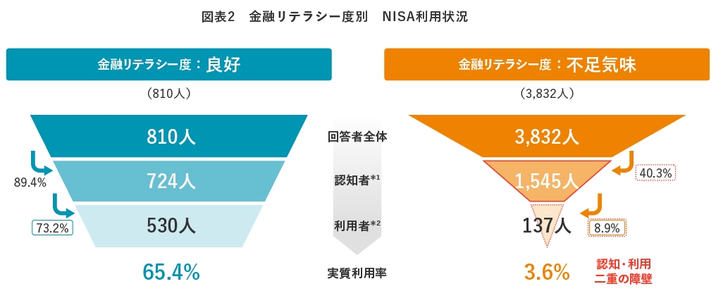 資産形成を後押しする税制優遇制度の利用状況はどうでしょうか?【図表2】では、NISA制度について「認知しているか」「認知している人のうち利用しているか」を段階的に示しています。